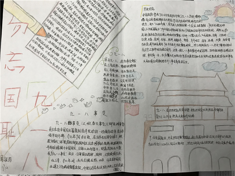 五彩的画笔勾勒出硝烟般的战场,耀眼的文字记录着中国惨痛的历史。每位学生以不同的形式认真的完成了手抄报,表示了他们对祖国的尊重,对革命先烈们的敬意!