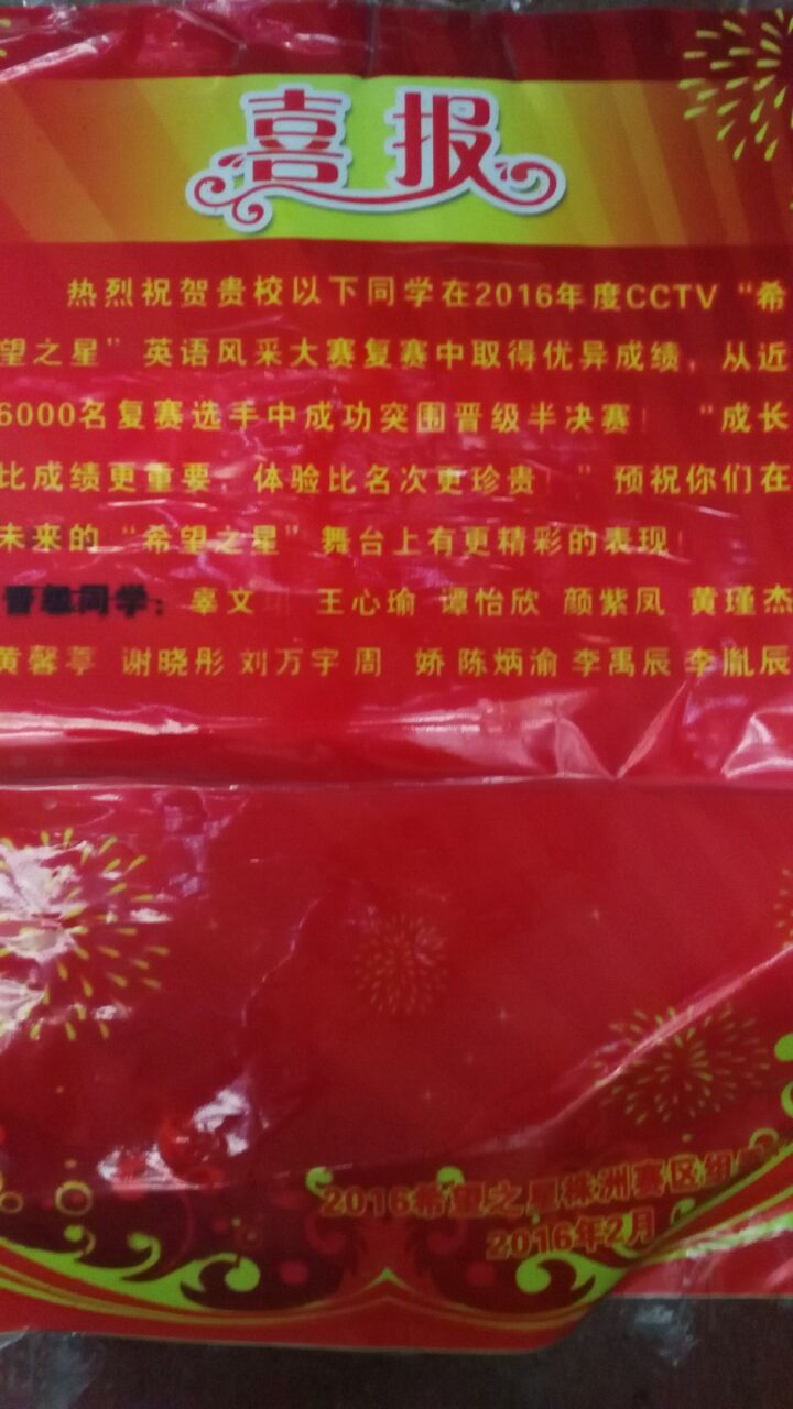 2016 CCTV希望之星英语风采大赛株洲赛区比赛隆重举行。我校12名同学从近6000名复赛选手中成功突围,晋级半决赛。日前,半决赛成绩揭晓,我校王心瑜、谢晓彤、谭怡欣三名同学成功闯入湖南省决赛!这是继去年我校沈实浩、孙玮萱两位同学分别以株洲市第二名和第十名的优异成绩晋级省决赛之后的又一佳绩。