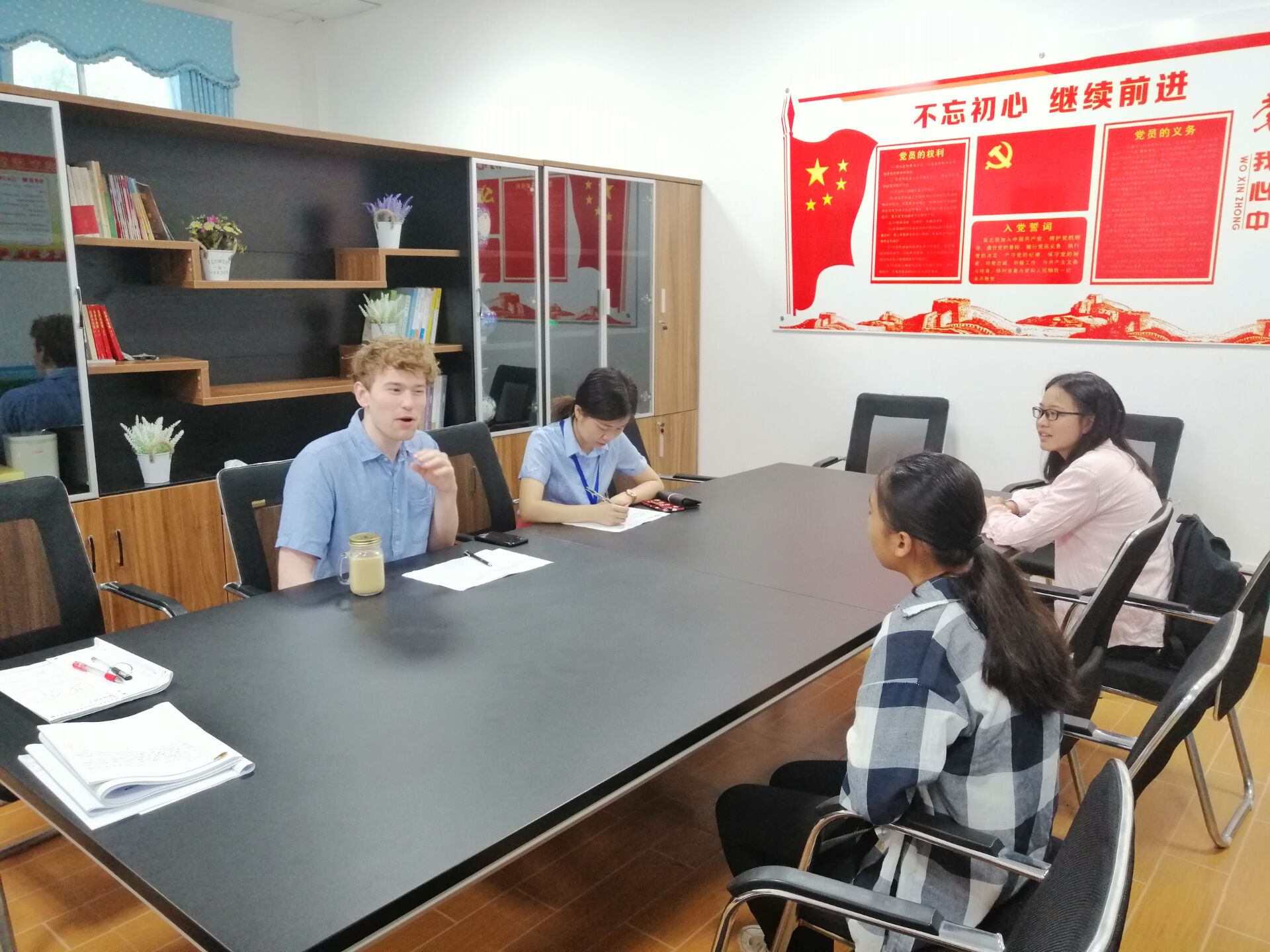 我校开设国际班,外教与英语老师为有意向出国留学的同学们进行英语口语测试。他们自信大方,努力表现自己的英语口语能力。